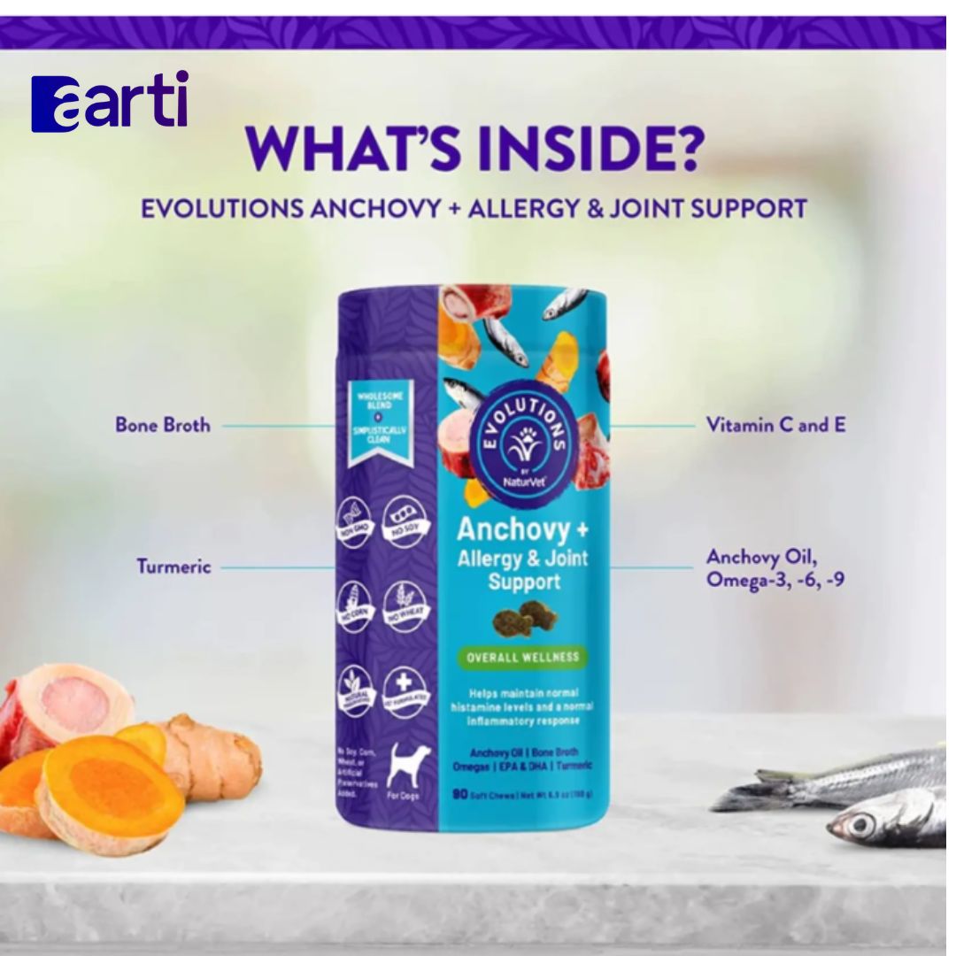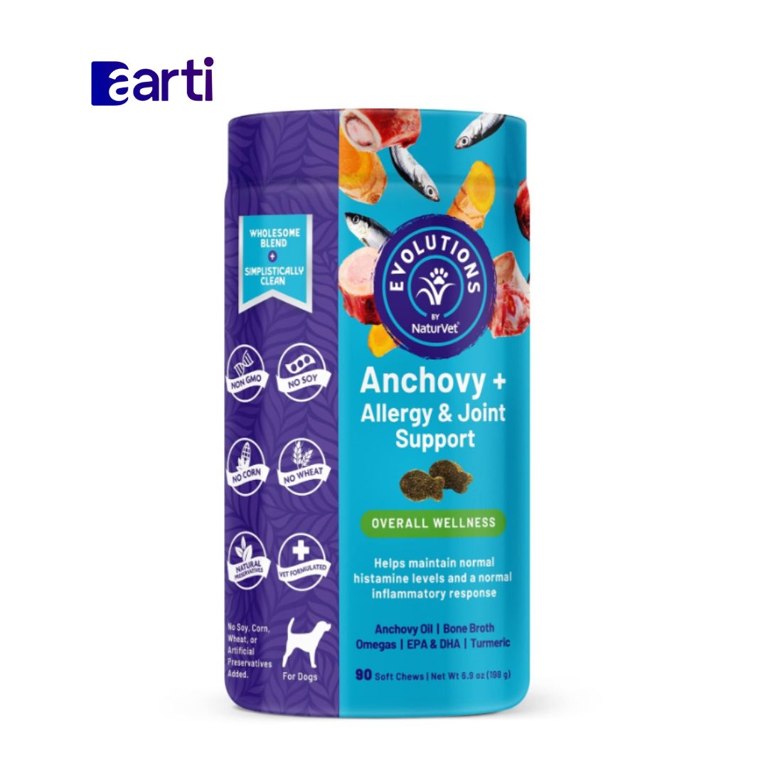 + Free ShippingEvolutions Anchovy + Allergy and Joint Chews son para perros mayores de 6 semanas. Contiene una rica fuente de ácidos grasos que son vitales para la salud diaria, músculos fuertes y articulaciones sanas. Los ácidos grasos omega-3, -6 y -9, EPA y DHA ayudan a mantener niveles normales de histamina y alivian los problemas de la piel asociados con las alergias estacionales. Los omegas también ayudan a mantener una respuesta inflamatoria normal y pueden ayudar a reducir la inflamación asociada con el ejercicio y la actividad diarios normales. El caldo de huesos y los antioxidantes ayudan a respaldar el funcionamiento saludable del sistema inmunológico.