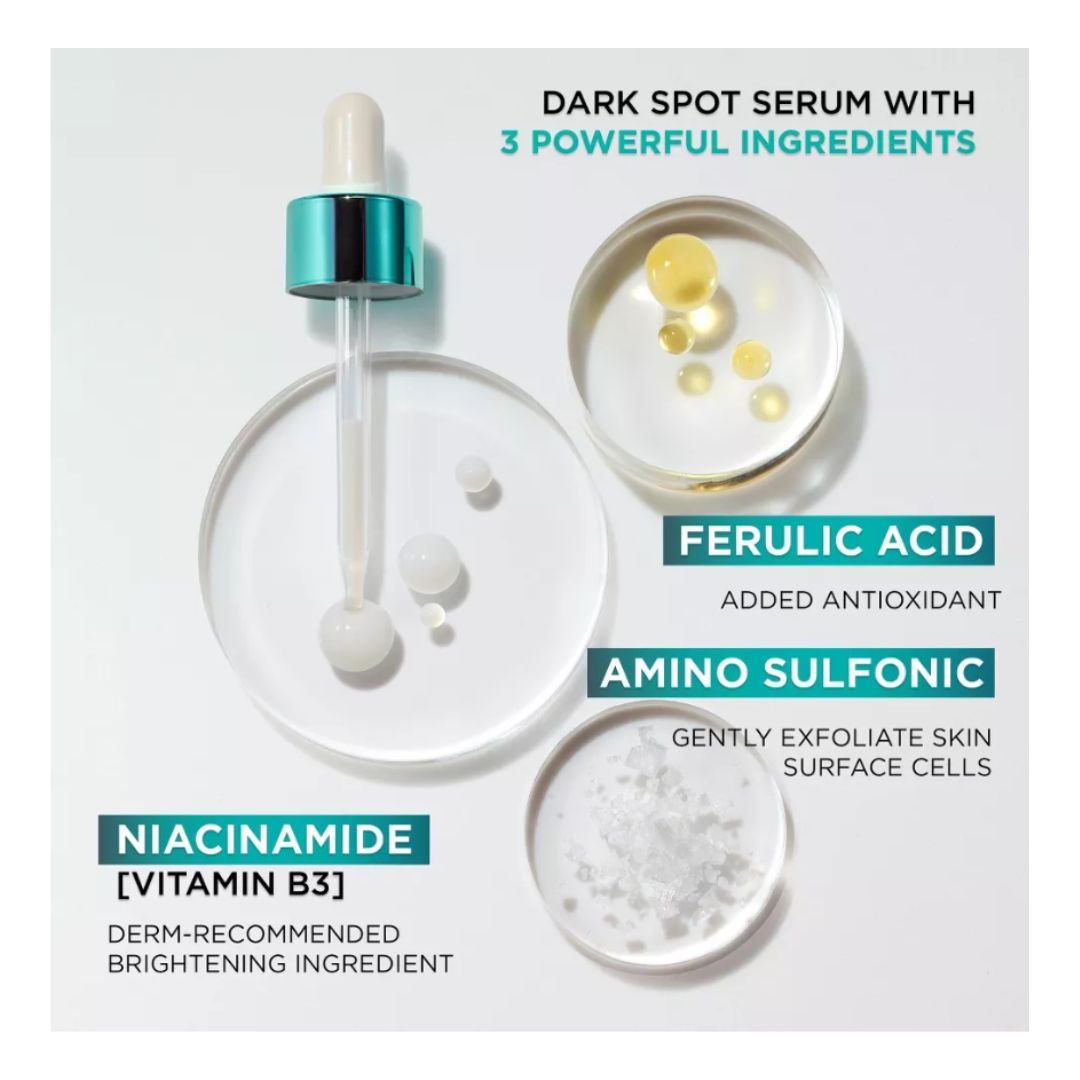 ¿Buscas atenuar visiblemente las manchas oscuras y las imperfecciones post acné? Descubre el sérum para manchas oscuras Bright Reveal Derm Intensives 12% Niacinamide + Amino Sulfonic + Ferulic de L’Oréal Paris. Este sérum para manchas oscuras causadas por la edad y el sol ayudará a atenuar visiblemente todo tipo de manchas oscuras. Está formulado con niacinamida (vitamina B3), un ingrediente iluminador recomendado por dermatólogos. Laboratorios expertos agregaron ácido ferúlico antioxidante y amino sulfónico para ayudar a exfoliar suavemente las células de la superficie de la piel e iluminarla. La tecnología que refleja la luz ayuda a revelar instantáneamente una piel más luminosa y de aspecto más fresco. Probado contra alergias, sin parabenos, colorantes ni aceites minerales. No graso. Probado por dermatólogos, apto para pieles sensibles. Para todo tipo de piel.